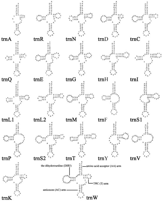 Secondary structures of the transfer RNA genes (tRNAs) in X. castanopsis mitogenome.