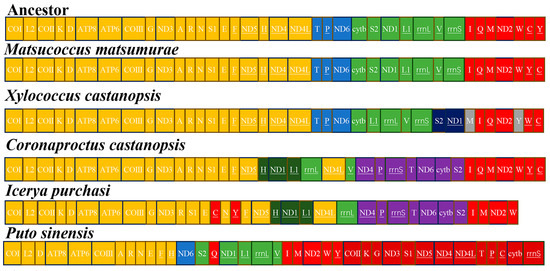 Gene orders in ancestor and scale insects’ mitogenomes. The order was divided into four relatively conserved gene regions colored with yellow, blue, green and red.
