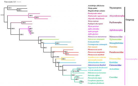 The phylogenetic analysis included a total of 31 species, comprising 19 species from the Coccomorpha, 4 species from the Aphidomorpha, 3 species from the Aleyrodomorpha, 2 species from the Psyllomorpha, and 3 species of order Thysanoptera. Phylogenetic relationship was inferred using Maximum Likelihood (ML) and Bayesian Inference (BI). A dataset comprising protein-coding genes from 31 species was concatenated in Phylosuite v1.2.2 for phylogenetic analysis [26]. Thirteen sequences were aligned in batches with MAFFT v7.505 using the ‘G-INS-i (accurate)’ strategy and codon alignment mode [27]. Ambiguously aligned fragments of 13 alignments were removed in batches using Gblocks v0.91b [28]. Finally, the 13 protein-coding genes were concatenated in Phylosuite. Before constructing Maximum Likelihood tree and Bayesian Inference tree, the protein-coding dataset was partitioned schemes for evolutionary models were selected using PartitionFinder v2.1.1 [29]. For the Maximum Likelihood tree, the best partitioning scheme and evolutionary models for the 13 protein-coding genes were selected using the greedy algorithm combined with the AICc criterion. However, for the Bayesian tree, the greedy algorithm was applied in conjunction with the BIC criterion. Maximum likelihood phylogenies were inferred using IQ-TREE v2.2.0 under the edge-linked partition model for 5000 ultrafast bootstraps, as well as the Shimodaira–Hasegawa-like approximate likelihood ratio test [30,31,32]. Bayesian Inference phylogenies were inferred using MrBayes v3.2.6 under the partition model (2 parallel runs, 2,000,000 generations) [33], in which the initial 25% of sampled data were discarded as burn-in.