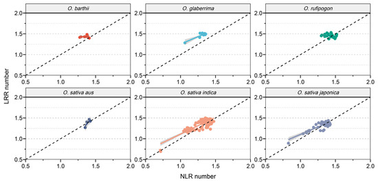 Previous studies have revealed a synchronized expansion and contraction pattern of NLR and LRR in rice. In order to further investigate the relationship between NLR and LRR in different subgroups of rice, we compared their proportions relative to the total gene count (Figure 3). Interestingly, in O. barthii and O. glaberrima, both the quantity and proportion of LRR were significantly higher than those of NLR. In the other four subgroups, there was a significant positive correlation between the quantity and proportion of NLR and LRR. This result suggests that during the domestication process of O. barthii and O. glaberrima, LRR genes exhibited a more pronounced expansion effect compared to NLR genes, while in the other four subgroups, the contraction and expansion of LRR and NLR genes were similar.