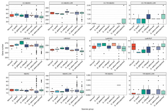 Comparison revealed that, except for the coiled-coil Toll-interleukin-1 receptor–nucleotide-binding adaptor shared by APAF-1, R proteins, and CED-4 (CC-TIR-NBARC) and Toll-interleukin-1 receptor–nucleotide-binding adaptor shared by APAF-1, R proteins, and CED-4 (TIR-NBARC) subfamilies, the remaining LRR and NLR families were distributed across all rice subgroups (Figure 4). Interestingly, the TIR-NBARC subfamily was identified in O. sativa indica, distributed across five genomes (NH083, NH123, NH170, NH220, and NH246).