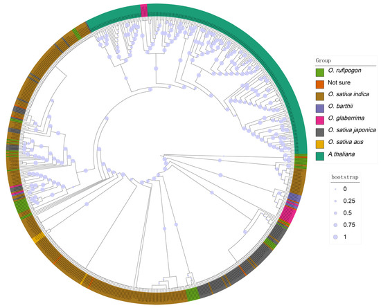 To obtain the phylogenetic relationships among the 300 rice genomes, we conducted a comparative analysis of all protein sequences using OrthoFinder (Version 2.5.4) [31], with all parameters set to their default values. The phylogenetic tree output by OrthoFinder served as the phylogenetic tree for the 300 rice genomes. The online tool iTOL (https://itol.embl.de/ (accessed on 15 May 2025), Version 6) [32] and the R package itol.toolkit (Version 1.1.7) [33] were used for visualizing the phylogenetic tree.