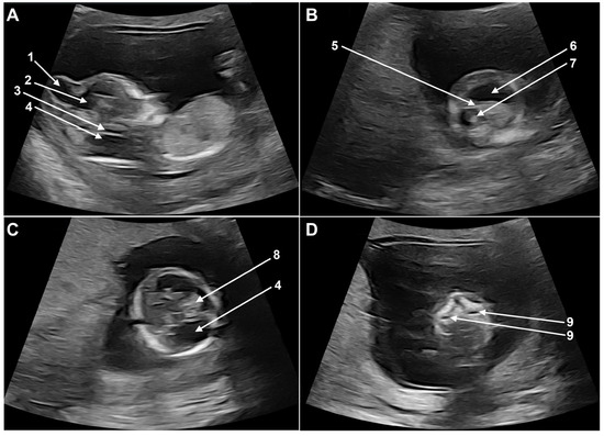 Fetal ultrasound images at the time of the first-trimester scan: (A) 1 + 2: cranial encephalocele and communication to right ventricle; 3: hypoplastic brain stem; 4: enlarged posterior fossa. (B) 5: asymmetric cerebral midline; 6: dilated left lateral ventricle; 7: right ventricle. (C) 8: choroid plexus; 4: enlarged posterior fossa. (D) 9: prominent maxillary cavities.