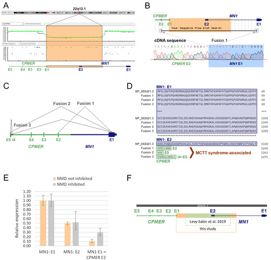 Analysis of a germline gene fusion in a fetus with severe brain malformations, involving a protein-coding (MN1) gene and a long non-coding RNA (CPMER) gene, indicates expression of disease-causing truncated proteins: (A) The detection of a heterozygous de novo deletion with breakpoints in the respective intron 1 of the genes MN1 and CPMER in the fetal germline. The deleted region chr22:27,714,323-27,772,264 (GRCh38/hg38) is highlighted in orange. (B) Sanger sequencing of cDNA reveals a direct linkage between the first exon of MN1 and exon 2 of CPMER. (C) Illustration of the identified RNA fusion transcripts and the related alternative splicing of the fusion pre-mRNA: Fusion 1: MN1 E1-CPMER E2, Fusion 2: MN1 E1-CPMER E5, and Fusion 3: MN1 E1-CPMER I4 (short segment)-CPMER E5. The respective junctions could be detected under both conditions, the inhibition of nonsense-mediated mRNA decay (NMD) as well as without NMD inhibition. No fusion transcripts were detected in controls. (D) In silico protein sequence alignment indicates the C-terminally truncated MN1 proteins associated with the identified fusion transcripts. The sequence of the MN1 wild-type protein NP_002421.3 is depicted as well, where the last 60 of the 1320 amino acids are encoded by exon 2. The expression of MN1 proteins lacking the amino acids encoded by exon 2 is causative for the MN1 C-terminal truncation (MCTT) syndrome via the gain-of-function effect [5]. (E) Quantitative RNA analysis indicates an almost equal expression of wild-type and MN1-CPMER fusion allele in the fetus. The analysis was performed under two conditions: NMD inhibition and without NMD inhibition. The expression levels of MN1 exon 1 (MN1: E1) were defined as reference values, as they are not specific for a certain allele. Expression of the wild-type-specific exon 2 amplicon (MN1: E2) was about half as high as exon 1 expression under standard conditions (NMD not inhibited). Accordingly, the wild-type allele and the gene fusion allele were expressed at almost the same level in the fetus. An expression level of less than 50% was observed for the fusion transcript MN1 E1-CPMER E2 under both conditions, reflecting the presence of multiple fusion transcripts. (F) Levy-Sakin et al. detected a different heterozygous exon 2 deletion of MN1 in an apparently healthy individual from the 1000 Genomes Project’s sample pool [12]. Compared to the fetal deletion (highlighted in orange), the deleted region chr22:27,723,174-27,766,326 (GRCh38/hg38) in the unaffected individual (highlighted in green) does not lead to the formation of a gene fusion with CPMER.