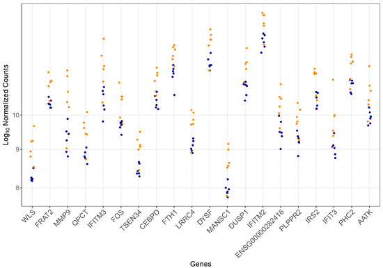 Expression levels of the top 20 differentially expressed genes (DEGs), ranked by adjusted p-value. Orange points represent Fabry patients with progressive nephropathy and dark blue points represent control subjects.