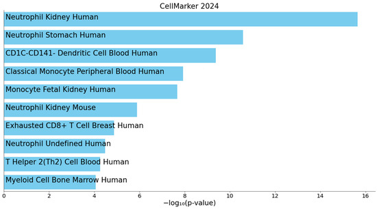 Bar plot showing the top 10 significantly enriched cell types among the differentially expressed genes (DEGs). Cell type enrichment analysis was performed using Enrichr with the CellMarker 2024 gene set library [20]. Cell types are ranked by −log10 (p-value).
