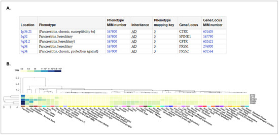 Genes associated with development of hereditary chronic pancreatitis. (A) The chart showing the genotype–phenotype relationship was obtained from the Online Mendelian Inheritance in Man (OMIM) database [4,5]. The location of each gene on the chromosome is provided. The inheritance pattern for all are autosomal dominant (AD) The OMIM gene number and phenotype numbers are provided. (B) A GTEX multi-gene expression query [6] was used to examine the expression of genes listed in (A). The pattern was sorted from the tissue with the highest expression (pancreas) to the lowest (breast/mammary). These data were obtained from the GTEX portal [6] on 4 April 2025.