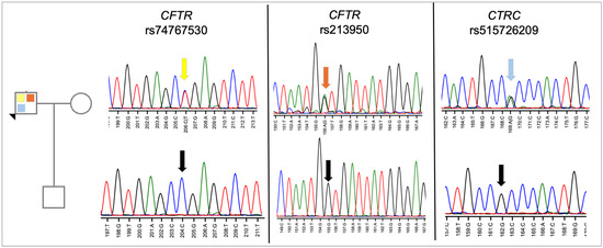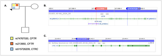 Family pedigree and variant positions in genome. (A) The proband is indicated by the arrowhead and is shown as a carrier of the nonsense CFTR variant rs747530, the missense CFTR variant rs213950, and the missense CTRC variant rs515262209. (B) The location of the two variants in CFTR, rs213950 and rs74767530. (C) The location of the rs515726209 in CTRC. The data in (B,C) were obtained using the NCBI SNP database genome variant viewer [17,22].