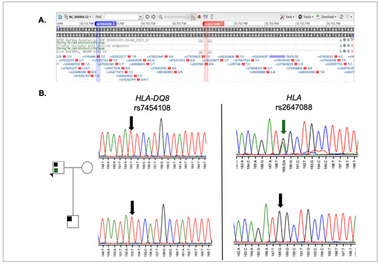 HLA locus analysis in proband and son. (A) SNP position in HLA locus. Data was captured from NCBI SNP database genome variant viewer for rs7454108 and rs2647088. [17,22]. The blue bar indicates the position of rs7454108 in the HLA gene, while the red bar indicates the position of rs2647088 in the HLA sequence (B) Sequence analysis results for HLA-DQ8 rs7454108 and HLA rs2647088. The green colored arrow on the HLA sequence points to the heterozygous nucleotide at that position. The color code direct relates to the variant color shown in the pedigree. The black arrows in the sequence indicate the reference sequence. The nucleotides in the chromatogram are colored as described in Figure 3.