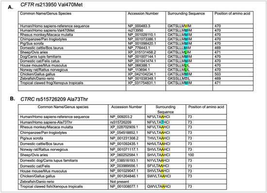 Phylogenetic analysis of the missense variants in CFTR (A) and CTRC (B). Common name, genus species name, accession number, sequence, and position of amino acid in the ortholog from each species are shown. Yellow highlighted amino acids indicate the amino acid in the reference sequence for that position. The blue highlight indicates the variant amino acid. The green amino acids in panel A indicate a different variant amino acid at that position.