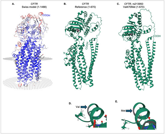 Tertiary structure of the reference and Val470Met CFTR proteins. (A) Swiss-Model [25] CFTR protein model, showing the predicted membrane-embedded regions (circular dotted areas) for the receptor (amino acids 1-1488). (B) IntFOLD7 predicted tertiary structure for amino acids 1-670 of the reference CFTR protein. The valine at position 470 is highlighted in pink. (C) IntFOLD7 predicted tertiary structure for amino acids 1-670 of the rs213950 variant protein. The methionine at position 470 is highlighted in pink. Close-up view of the tertiary structure near the valine 470 in the reference protein (D), and the methionine 470 in the variant protein (E).