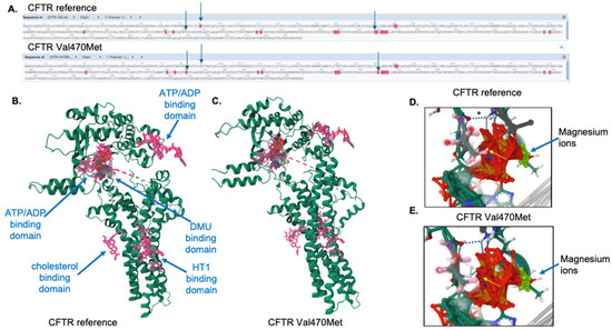 Ligand binding analysis for the reference and variant CFTR proteins. (A) Predicted ligand-binding amino acid interactions are shown in pink highlights. Arrows indicate ligand binding differences between the reference and variant proteins. This figure was generated and edited from the FunFold software. (B) The CFTR reference protein with ligands are indicated by pink residues and labeled. (C) The Val470Met CFTR protein with ligands are indicated by pink residues. The threonine 460 amino acid residue is highlighted in pink for the reference (D) and variant (E) CFTR proteins. The arrow indicates the predicted loss of interaction with the ATP/ADP binding domain.