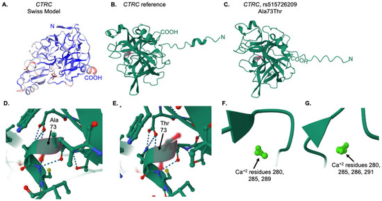 Swiss-Model [25] was used to obtain a predicted model of the complete CTRC sequence (Figure 8A). The amino (N) and carboxy (COOH) ends of the protein chain are indicated. The IntFOLD7 server was then used to generate predicted models for both the reference and variant protein sequences. As shown in Figure 8B, the reference protein model predicted by IntFOLD7 was consistent in overall globular structure, with slight differences in the N- and C-terminal regions. The alanine at position 73 in the reference protein is highlighted in pink (Figure 8B). Likewise, the same sequence with the variant threonine residue at position 73 was input into the IntFOLD7 server, and the resultant 3D structure is consistent with the CTRC protein (Figure 8C), with some notable differences in the loss of an α-helical structure at the N-terminus. A closer view of the local region for alanine 73 (Figure 8D) and threonine 73 (Figure 8E) are shown. Using the FunFold program as part of the IntFOLD7 server, predicted ligands were analyzed. While there were no differences in amino acid interaction with all predicted CTRC ligands, which included PBZ (p-amino benzamidine), FUL (β-L-fucopyranose), and TFI (an aniline drug compound; a difference was noted in the number of bound calcium molecules between the reference and variant CTRC proteins. As shown in Figure 8F,G there are three calcium molecules (numbered 280, 285, and 289 by the prediction software) in the reference CTRC protein, but four calcium molecules (numbered 280, 285, 286, and 291) in the Ala73Thr variant protein. Calcium binding is essential for CTRC protein interaction [29]. The effect of this change in calcium ion number within the variant protein remains unknown.
