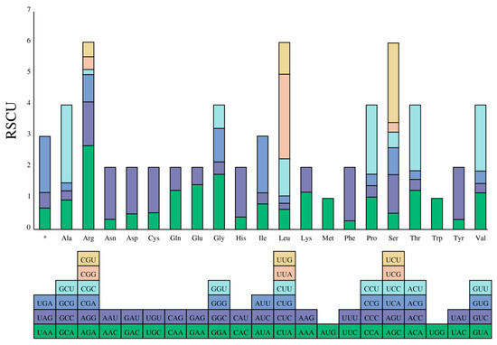 The composition of bases, patterns of codon usage, and relative synonymous codon usage (RSCU) are integral to the regulation of gene expression and the stability of mRNA. These aspects also offer key insights into evolutionary trends and the phylogenetic connections among species. Within the mitogenome of L. japonica, 13 PCGs are encompassing a total of 3733 codons (Figure 5 and Supplement Table S2). Notably, certain amino acids demonstrate higher frequencies in these codons. Leucine, isoleucine, phenylalanine, serine, valine, and glycine emerge as the most common, contributing to 13.42%, 10.80%, 10.58%, 8.30%, 6.46%, and 6.16% of the total codons, respectively, whereas tryptophan is the least common, making up only 1.04%. These observations underscore the significance of codon usage in unraveling evolutionary trends and deepening our understanding of phylogenetic linkages. The variation in amino acid frequencies across codons may be attributed to multiple factors, such as the specific roles of genes, the evolutionary trajectory of the organism, and environmental influences. Grasping these factors enriches our comprehension of evolutionary dynamics and the interconnectedness of diverse species.