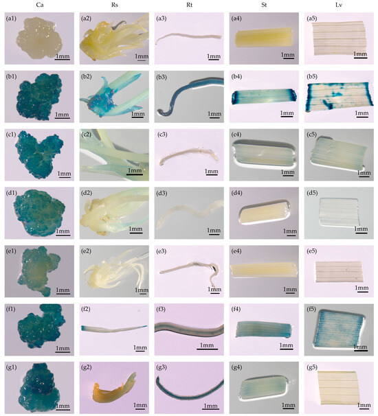 Promoters with callus-preferred expression, as shown by GUS staining. (a1–a5) Non-transformed control. (b1–g5) The reporter vectors containing the GUS gene driven by the 35S, pOsTDL1B, pOsEDC, pOsDLN53, PD2P4, and P060 promoters, respectively. Ca, Rs, Rt, St, and Lv represent calli; regenerated shoots cultured on regeneration medium; and roots, stems, and leaves of seedlings grown on rooting medium of T0 transgenic rice, respectively. Scale bars = 1 mm.