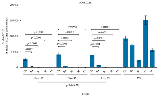 Quantification of GUS activity in transgenic rice carrying the pOsTDL1B:GUS construct. Calli, regenerated shoots cultured on shoot-regeneration medium, and roots, stems, and leaves of seedlings grown on rooting medium were used for extraction of total proteins. Lines 113, 55, and 95 are three independent transgenic events for the pOsTDL1B vector. Ca, Rs, Rt, St, and Lv represent calli, regenerated shoots cultured on regeneration medium, and roots, stems, and leaves of T1 seedlings grown on rooting medium. 35S is a constitutive CaMV 35S promoter (35S:GUS) that served as a positive control. Data are shown as means ± SD (n = 3). p-values were determined using one-way ANOVA test with Tukey’s multiple comparisons test. Ns represents no significance.