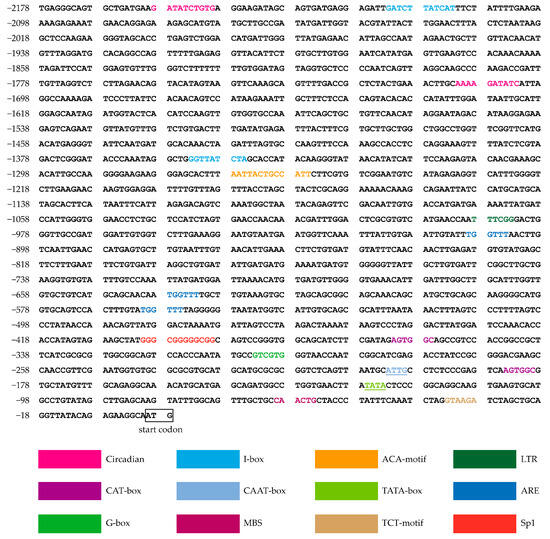 To assess the presence of cis-acting elements, promoters were predicted for the 2178 bp upstream of the ATG translation start site. The cis-acting elements identified in the pOsTDL1B promoter are shown in Figure 5. In addition to a putative TATA box and a CAAT box, several other responsive elements were found in the pOsTDL1B promoter. The cis-acting regulatory elements detected included seven light-responsive elements (TCT-motif, Sp1, I-box, G-box, ACA-motif), suggesting that the promoters may be involved in callus formation and callus-specific gene expression through the regulation of light. The identified elements also included three cis-acting regulatory elements critical for the anaerobic induction at different locations (anaerobic responsive elements, ARE), two elements associated with circadian rhythm control (circadian), a low temperature-responsive (LTR) element box, two cis-acting elements associated with meristem expression (CAT-box), and a drought response element (MYB binding site, MBS).