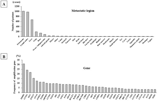 Metastatic lesions and gene amplification of GC cases from C-CAT data. (A) Metastatic sites of 2028 GC patients. Multi-cancer genome profiling of 2028 GC cases in the C-CAT database showed that the most frequent site of metastasis was the peritoneum, followed in order by the LN, liver, lung, and bone. (B) Amplified genes in GC patients with LN metastasis. The most frequently amplified gene was ERBB2, followed by CCNE1 and MYC. ERRB2 amplification was frequently detected in GC patients with or without LN metastasis.