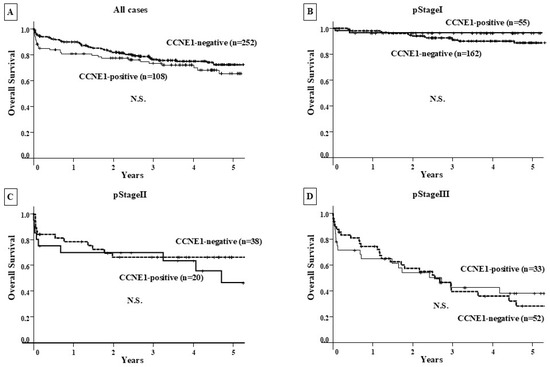 Overall survival curve. (A–D) Prognostic comparison between the CCNE1-positive and CCNE1-negative groups at each clinical stage showed no significant difference.