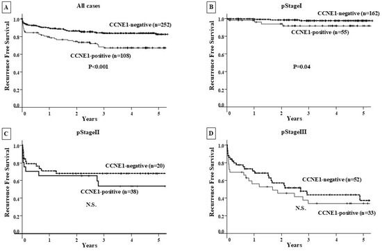 Recurrence-free survival curve. (A) RFS was compared between the CCNE1-positive and CCNE1-negative groups in all patients. The CCNE1-positive group had a significantly (p < 0.001) worse prognosis than the CCNE1-negative group. (B) The prognosis of CCNE1-positive and CCNE1-negative patients was compared by clinical stage. CCNE1-positive patients had a significantly poorer RFS than CCNE1-negative patients (p = 0.04). (C,D) The prognostic comparison between the CCNE1-positive and CCNE1-negative groups at clinical stage II/Ⅲ showed no significant difference.