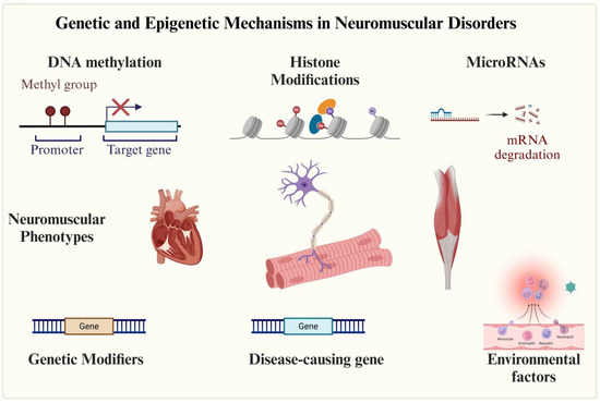 Due to these layered regulatory influences, genotype-phenotype correlations in NMDs are often complex. Phenotypic variability reflects not only the primary genetic variant but also modifier genes, epigenetic states, and environmental interactions [5]. Herein, we discuss the most relevant genetic and epigenetic factors involved in NMDs, drawing on evidence from both human studies and animal models, with the aim to provide a deeper understanding of the complex interplay between genetic and epigenetic factors in shaping the clinical manifestations of NMDs.