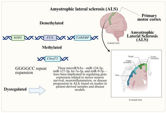 As mentioned before, ALS is a progressive neurodegenerative disease characterized by motor neuron loss, driven by multiple pathological mechanisms, including oxidative stress, mitochondrial dysfunction, protein aggregation, excitotoxicity, neuroinflammation, and impaired axonal transport [66]. Epigenetic alterations, such as DNA hypermethylation and chromatin remodeling, are also implicated, with increased 5-methylcytosine (5 mC) levels and the elevated expression of DNA methyltransferases (DNMT1 and DNMT3a) observed in ALS motor neurons [67].