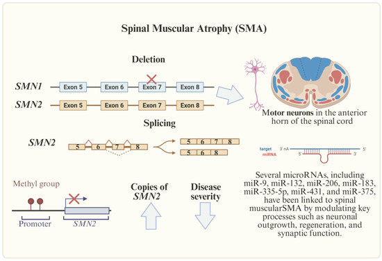 Genetic and epigenetic factors involved in SMA. SMA, caused by SMN1 deletions, is influenced by SMN2 copies, methylation, and deregulated miRNAs (e.g., miR-1-3p, miR-133b), which hold promise as biomarkers and therapeutic targets.
