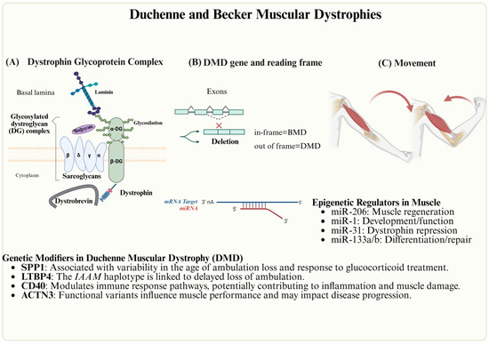 Genetic and epigenetic factors involved in DMD. (A) Dystrophin Glycoprotein Complex, (B) the DMD gene, and (C) muscular contraction.