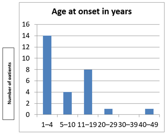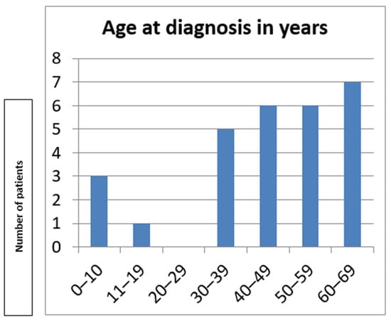 Mean age at diagnosis was 44.75 ± 18.03 years, ranging from 8 to 69 years (Figure 3). The diagnostic delay ranged between 5 and 58 years after the initial symptoms. None of the patients were wheelchair-bound at the time of the last assessment. No growth retardation was present in our cohort.