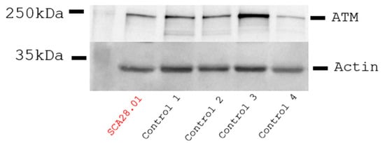 Immunoblotting of total protein lysates from EBV-transformed lymphoblasts derived from patient 11 (SCA28.01) and four male age-matched control individuals. No reduction in the ATM levels was detected in the patient compared to controls. Actin expression is used for band intensity normalization.