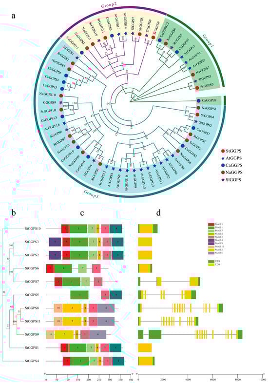 Phylogenetic, gene structure, and conserved motif analysis of the GGPS gene family. (a): Phylogenetic tree of the GGPS gene family in A. thaliana, S. tuberosum, N. attenuata, S. lycopersicum, and C. annuum. (b): Phylogenetic tree of the StGGPS gene family. (c): Conserved motif analysis of the StGGPS gene. (d): Analysis of StGGPS gene structure.