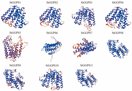 To further elucidate the evolutionary relationships among StGGPS genes, we analyzed the intron–exon substructure and conserved motifs of potato StGGPS members (Figure 1). The genetic structure of different StGGPS members exhibits considerable variation, ranging from intronless genes to those containing up to 11 introns. This diversity in gene structure suggests that StGGPS genes may have been subjected to divergent selection pressures during evolution. Notably, StGGPS genes within the same subfamily generally displayed similar gene structures, a pattern consistent with the phylogenetic tree, indicating a strong correlation between the intron–exon gene structure of StGGPS genes and their phylogenetic relationships. Given the association of conserved sequence elements with protein function, we employed MEME to identify 10 distinct motifs (Motif 1 through Motif 10). The number of motifs present in each StGGPS member ranged from three to seven; for instance, StGGPS5 contains a minimum of three motifs, while StGGPS2 and StGGPS3 possess a maximum of seven. Although certain motifs are absent in some StGGPS members, a conserved pattern, particularly Motif 3, is consistently observed across all StGGPS genes. Furthermore, analysis of the predicted three-dimensional structures revealed a higher degree of structural similarity among proteins within the same subfamily compared to those from different subfamilies. For example, StGGPS8, StGGPS9, and StGGPS11 from Group 2 exhibit similar structures, as do StGGPS1, StGGPS2, StGGPS3, StGGPS4, and StGGPS10 from Group 3 (Figure 2). Collectively, this integrated analysis of the phylogenetic tree, gene structure, and conserved motifs suggests that StGGPS members within the same subfamily share similar gene functions and protein structures, implying analogous functional roles. We hypothesize that the observed similarities in gene structures and conserved motifs among StGGPS genes are indicative of functional convergence.