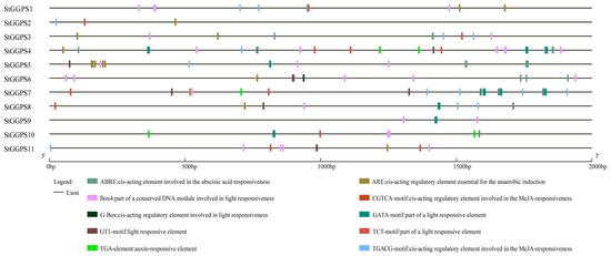 The cis-acting elements within 2 kb upstream of the potato GGPS gene promoters [30] were analyzed using the PlantCARE database, and the elements were visualized using the GGPS 2.0 website (http://gsds.gao-lab.org/, on 27 May 2024) [25].
