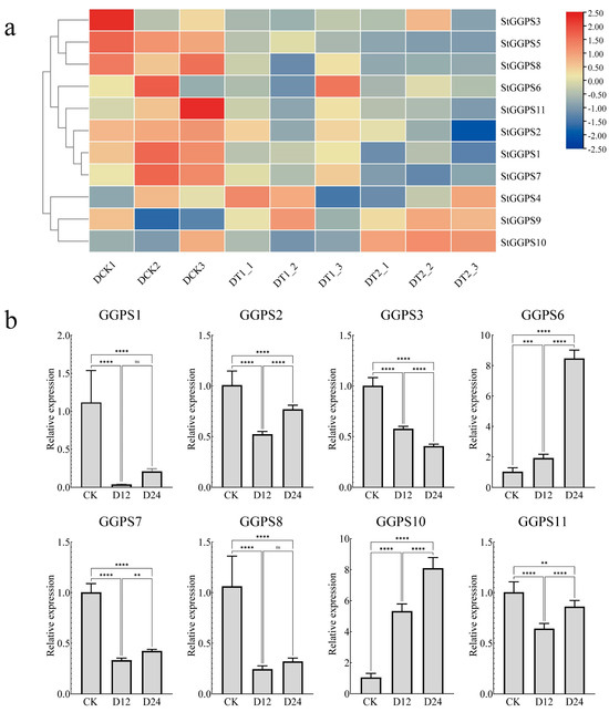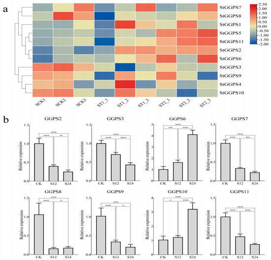 Chromosomal positions of StGGPS family members were extracted from the genome annotation file using Tbtools II. We found that chromosome 2 contained three StGGPS genes; chromosomes 7 and 10 contained two StGGPS genes; and chromosomes 4, 9, 11, and 12 contained only one StGGPS gene (Figure 3a).
