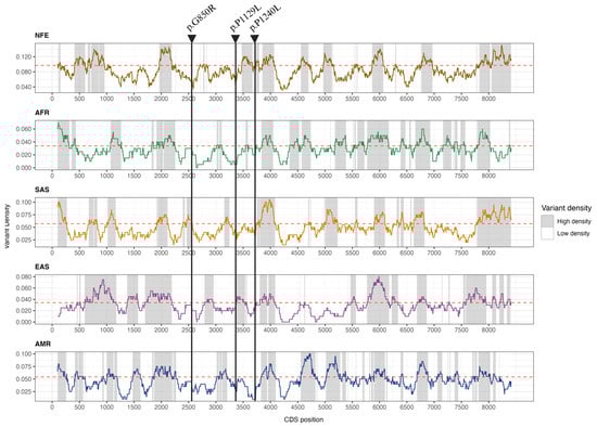 Variant density profile along the OTOG CDS in the NFE, AFR, SAS, EAS, and AMR populations calculated with a 201 bp sliding window. The threshold density for each population based on the anticipated number of variants within CDS is indicated by the red dashed line.