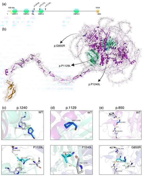 All three missense variants are located in and around the von Willebrand factor type D 3 (VWFD3) domain. The VWFD, EGF-like, and TIL domains are found in the head of the protein, while the CTCK domain is located in the tail (Figure 2a,b).