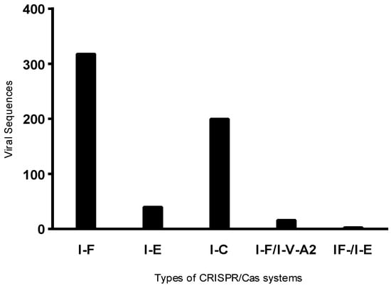 Of the 841 viral sequences observed, 587 were identified in isolates positive for the CRISPR system. Upon analyzing the frequency of these sequences by system type, phages were more frequently detected in hosts harboring the Type I-F system (Figure 1), which may be associated with the higher number of isolates positive for the I-F type. Furthermore, an average of four prophages per isolate was observed in Type I-F positive isolates, three in isolates harboring the I-E system, and seven in those with the I-C system.