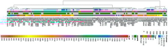A dendrogram was constructed to demonstrate the relationship among P. aeruginosa isolates regarding the type of CRISPR/Cas system, MLST profile, and the number of prophages per genome. Figure 2 shows the distribution of the isolates in relation to these genetic characteristics. It was observed that the clusters were formed in a heterogeneous manner with respect to the isolates, but showed internal homogeneity regarding the analyzed characteristics (Figure 2).