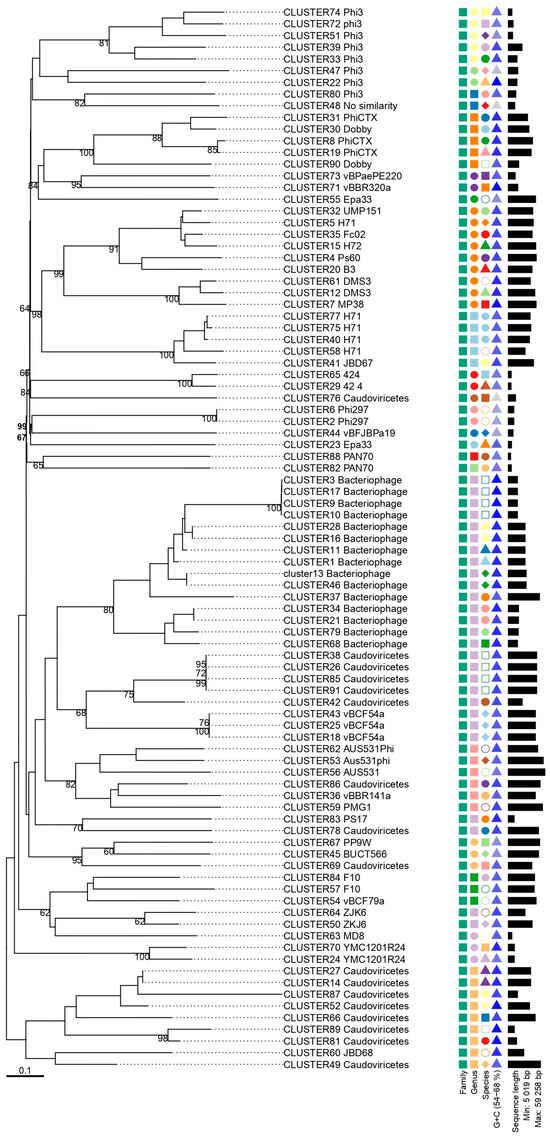 For each cluster formed, a representative sequence was selected to better understand the phylogenetic distribution of the phages classified as Bacteriophage and Caudoviricetes. This selection was based on the sequence with the highest similarity among the sequences within each cluster.