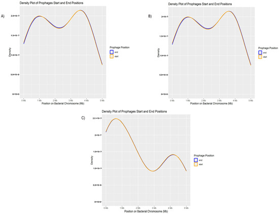 No concentration in specific genomic regions was observed. Based on the density plot (Figure 5A), the start and end positions of the prophages along the bacterial chromosome showed a continuous and dispersed distribution across the genome, suggesting that rather than integrating into preferential loci, prophages may be inserted at various sites throughout the host DNA, indicating a random pattern of genomic dispersion.