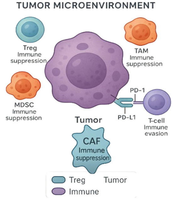 The TME is another critical factor affecting immunotherapy efficacy. GU tumors often create immunosuppressive microenvironments populated by regulatory T-cells (Tregs), myeloid-derived suppressor cells (MDSCs), and tumor-associated macrophages (TAMs), all of which suppress anti-tumor immunity (Figure 2) [48]. A recent study further elaborates on how these immune cell populations modulate the TME to evade immune surveillance, hindering the effectiveness of ICIs [49]. Strategies to overcome this resistance include combination therapies aimed at reprogramming the TME, such as using inhibitors of TGF-β signaling or myeloid cell depletion.