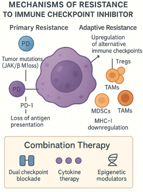 Mechanisms of resistance to ICIs. This schematic depicts both primary and adaptive resistance pathways by which tumors evade the checkpoint blockade. Primary resistance arises from tumor-intrinsic defects—such as JAK1/2 or β2-microglobulin loss—leading to impaired antigen presentation and T-cell exclusion. Adaptive resistance involves compensatory immune evasion strategies: the upregulation of alternative inhibitory receptors (e.g., TIM-3, LAG-3), the recruitment of immunosuppressive cells (Tregs, MDSCs (myeloid-derived suppressor cells), TAMs (tumor-associated macrophages)), and MHC-I (Major Histocompatibility Complex) downregulation. Combination approaches—dual checkpoint blockade, cytokine therapy, and epigenetic modulators—are under investigation to overcome these barriers. Created with Official Adobe Photoshop—Photo & Design Software.