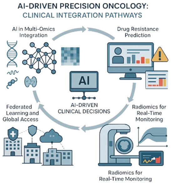 To visually support these concepts, Figure 5 illustrates the diverse applications of AI in precision oncology. It highlights four interconnected clinical integration pathways: AI-powered multi-omics integration for therapy outcome prediction, machine learning-based drug resistance forecasting, radiomics for real-time monitoring, and federated learning frameworks that enable secure, collaborative AI model training across institutions.