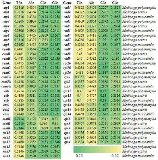 Heatmap of nucleotide composition at the third codon position in the mitochondrial genomes of three Medicago species.