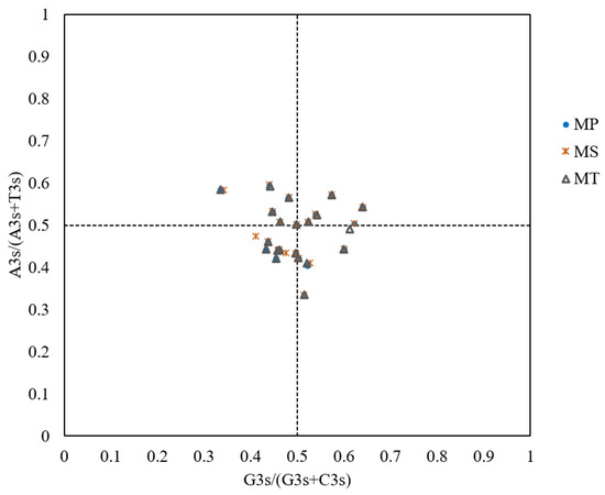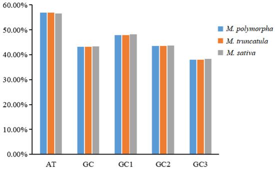 The complete mitochondrial genome sequences of M. polymorpha (MP, accession number MW971562), M. sativa (MS, accession number ON782580), and M. truncatula (MT, accession number KT971339) were downloaded from the GenBank database of the National Center for Biotechnology Information (NCBI) (https://www.ncbi.nlm.nih.gov/ (accessed on 15 September 2024)). CDSs were screened based on the criteria of length >300 bp, start codon ATG, and stop codon TGA, TAA, or TAG. Redundant CDSs were filtered out by retaining only the longest CDS sequence. Ultimately, the mitochondrial CDSs that were common to all three species were retained for analysis [24]. This rigorous filtering process resulted in a final dataset of 21 high-quality, non-redundant CDSs that were common to all three species and suitable for our comparative analysis.