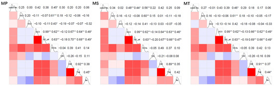 Correlation heatmap of codon usage indices in three Medicago species. codon No: codon number; GC1: GC content of codon base 1; GC2: GC content of codon base 2; GC3: GC content of codon base 3; GCall: total codon GC content; GC3s: GC content of mitochondrial genome synonymous codon base 3; CAI: codon adaptation index; CBI: codon preference index; Fop: frequency of optimal codon usage; ENC: effective codon count; **: significant correlation at the 0.01 level; *: significant correlation at the 0.05 level. In the upper-right section, numerical values quantify the correlation coefficients between the indices. The lower-left section uses colored blocks to visually depict these correlations, where red signifies a positive correlation and blue indicates a negative one. The intensity of the color reflects the strength of the correlation, with darker shades representing stronger associations.