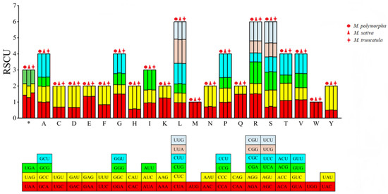 RSCU of codons in the CDSs of the mitochondrial genomes of three Medicago species. Each color in the stacked bars corresponds to a specific synonymous codon for the amino acids. The same colors are used in the RSCU bar chart above to represent the RSCU values of the respective codons. * indicates the stop codons.