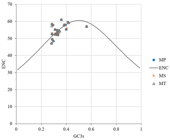 The ENC values (y-axis) were plotted against GC3 (x-axis) with an expected ENC curve, calculated as follows: