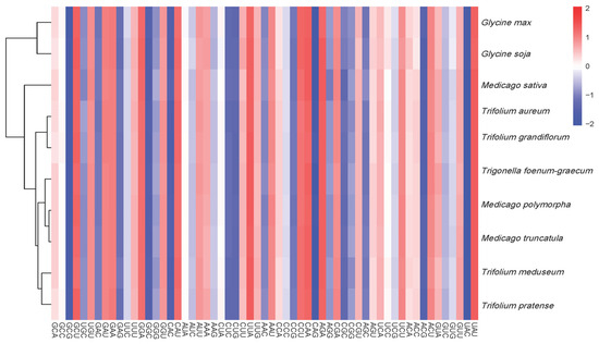 Mitochondrial CDSs from 10 species (8 Trifolieae taxa including Medicago species, plus the outgroups Glycine max and Glycine soja) were retrieved from NCBI (Table 1). Shared CDSs were aligned using MAFFT [30] (https://www.ebi.ac.uk/Tools/msa/mafft/ (accessed on 12 October 2024)), and a Maximum Likelihood (ML) phylogenetic tree was constructed in MEGA 11 [31] (1000 bootstrap replicates). RSCU-based hierarchical clustering was performed online in BioLadder [32] (https://www.bioladder.cn/ (accessed on 12 October 2024)) using Pearson correlation coefficients.