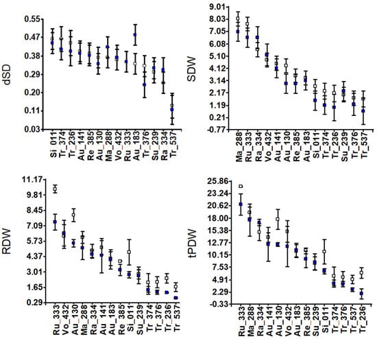 Accession means and standard deviations for vegetative traits: development of new leaves (dLN) and stem diameter (dSD); leaf, stem and root dry weights (LDW, SDW and RDW); and total plant dry weight (tPDW) in grams. White and blue squares indicate control and salinity conditions, respectively.